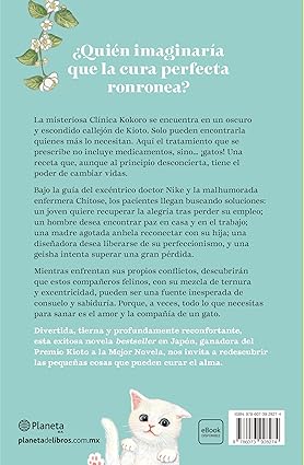 ¿Quién imaginaría que la cura perfecta ronronea? En un oscuro callejón de Kioto se esconde la Clínica Kokoro, un lugar envuelto en misterio al que solo llegan quienes más lo necesitan. Su peculiar tratamiento consiste en “prescribir” gatos, una solución que desconcierta a los pacientes, pero que guarda el potencial de cambiar sus vidas. Guiados por el excéntrico Dr. Nike y su malhumorada enfermera Chitose, los pacientes buscan respuestas: un joven administrador, cómo recuperar la alegría tras perder su empleo; una madre agotada, la forma de reconectar con su hija; una diseñadora, el descanso que tanto necesita; y una geisha, el consuelo tras una pérdida dolorosa. Cada uno enfrenta sus conflictos internos mientras encuentra en sus compañeros felinos una inesperada guía, demostrando que, a veces, el amor y la compañía de un gato pueden ser el primer paso hacia la sanación.